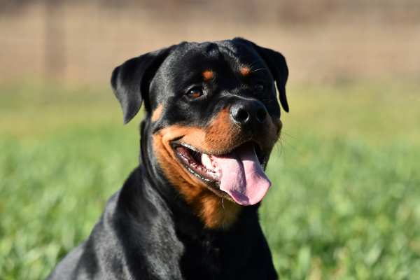 The Rottweiler is a medium to large size breed that originated in Germany, where it was used to drive cattle and pull carts for farmers and butchers. They are physically and mentally tough, but require careful training to respect their owner as “pack leader”.
