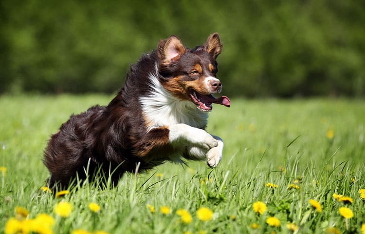 The Australian Shepherd is often noted for it’s medium length wavy coat that has a thick undercoat and comes in a range of colours. Australian Shepherds or “Aussies” can be blue merle, red merle, solid black and solid red, and variations with white and a copper trim.